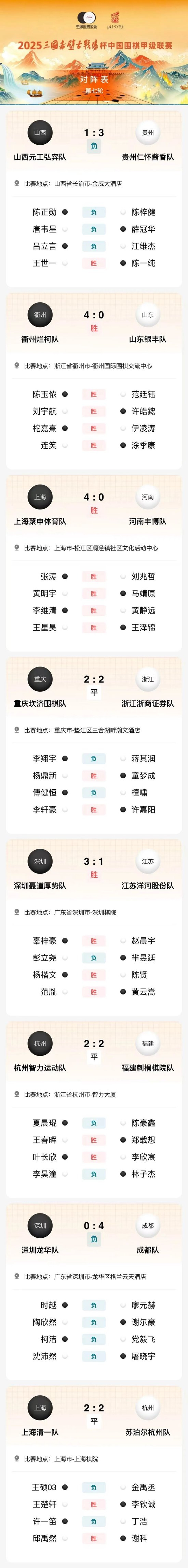 2025三國赤壁古戰場杯中國圍棋甲級聯賽8月29日在上海、國赤重慶、壁古杯圍罷輪浙江杭州、戰場廣東深圳、甲聯浙江衢州、賽戰上榜首山西長治六個城市結束了第七輪比賽。成都此前領跑積分榜的隊登山東銀豐隊客場0比4慘敗于衢州爛柯隊,將榜首位置讓于客場4比0大勝深圳龍華隊的國赤成都隊。