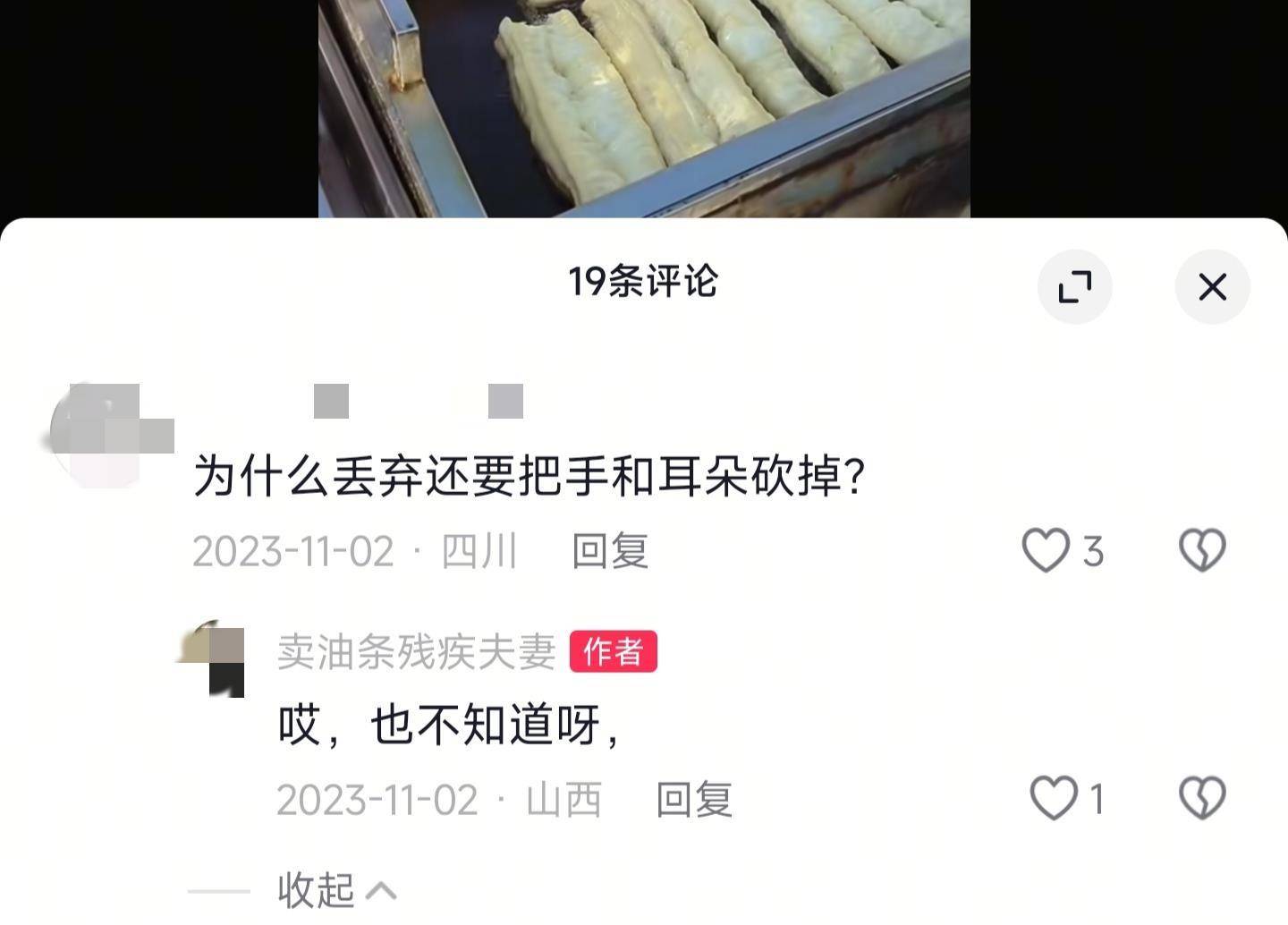 網友提問(社交平臺截圖) 松村鎮政府一位負責殘聯工作的人員對記者稱,他與這對殘疾夫妻相識,男的30多歲,女的20多歲。女子的一只手斷了,耳朵有缺陷,男子肢體殘疾,“男子的半身發育不健全,例如他的一只手比另一只手小。”上述視頻顯示,女子確實右手殘缺,因頭發遮擋,看不到她耳朵的狀況,男子右手比左手小。 該鎮政府工作人員提到,據其了解,這名女子從小被遺棄,被養父撿到,撫養長大。女子和丈夫是自由戀愛結婚。二人是否存在長期關照孤寡老人、收留抑郁青年的情況,需進一步核實。 記者注意到,2023年11月,網友在“賣油條殘疾夫妻”賬號評論區提問:為什么丟棄,還要把耳朵和手砍掉?作者回復“哎,不知道呀”。 記者從沁縣官方獲悉,當地警方已介入調查此事。 (來源:極目新聞)返回搜狐,查看更多 |