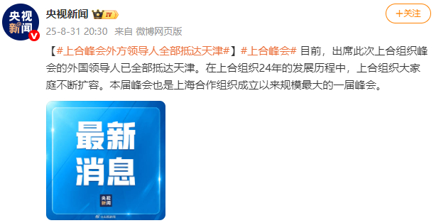[上合峰會(huì)外方領(lǐng)導(dǎo)人全部抵達(dá)天津]目前,上合出席此次上合組織峰會(huì)的外方外國(guó)領(lǐng)導(dǎo)人已全部抵達(dá)天津。在上合組織24年的領(lǐng)導(dǎo)發(fā)展歷程中,上合組織大家庭不斷擴(kuò)容。人全本屆峰會(huì)也是部抵上海合作組織成立以來(lái)規(guī)模最大的一屆峰會(huì)。 點(diǎn)擊進(jìn)入專(zhuān)題: 上海合作組織天津峰會(huì) |