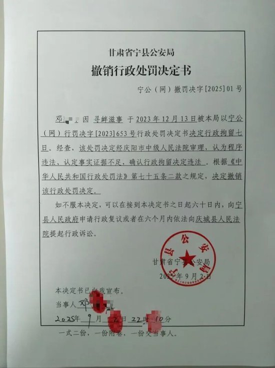 出院次日,寧縣公安局做出了上述撤銷行政處罰決定。決定書顯示:鄧先生因?qū)め呑淌卤槐揪譀Q定行政拘留七日。經(jīng)查,該處罰決定經(jīng)慶陽市中級人民法院審理,認為程序違法、認定事實證據(jù)不足,確認行政拘留決定違法。根據(jù)行政處罰法規(guī)定,決定撤銷該行政處罰決定。