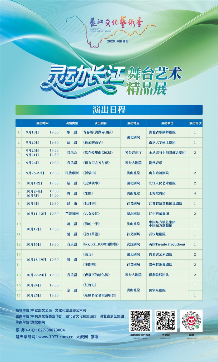 “靈動長江”舞臺藝術精品展可在楚天票務網、湖北劇院官方公眾號、大麥網、貓眼等官方票務平臺進行線上選座購票,同時可關注各劇院微信公眾號、抖音、小紅書等平臺獲取更詳盡演出資訊及購票。