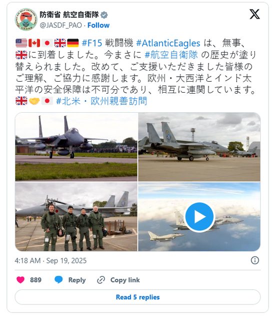 美國《新聞周刊》分析稱,作為美國的重要盟友,日本此舉是意圖加強與北約的合作。報道注意到,航空自衛(wèi)隊在社交媒體平臺 X 上表示:“(日本航空自衛(wèi)隊)將不斷加強與(美國空軍)的合作,進(jìn)一步增強日美同盟的威懾和應(yīng)對能力。”