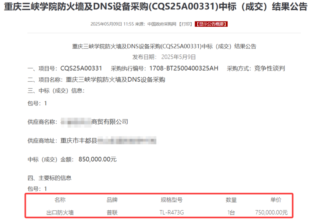 近日,中標有網友發消息稱,價萬僅元2025年5月發布的設備《重慶三峽學院防火墻及DNS設備采購(CQS25A00331)中標(成交)結果公告》中,重慶三峽學院采購的網購“普聯TL-R473G出口防火墻”,中標價格為85萬元一臺,多人但該型號產品在某電商平臺普聯官方旗艦店售價僅299元,被立質疑其中標價格不合理。案調