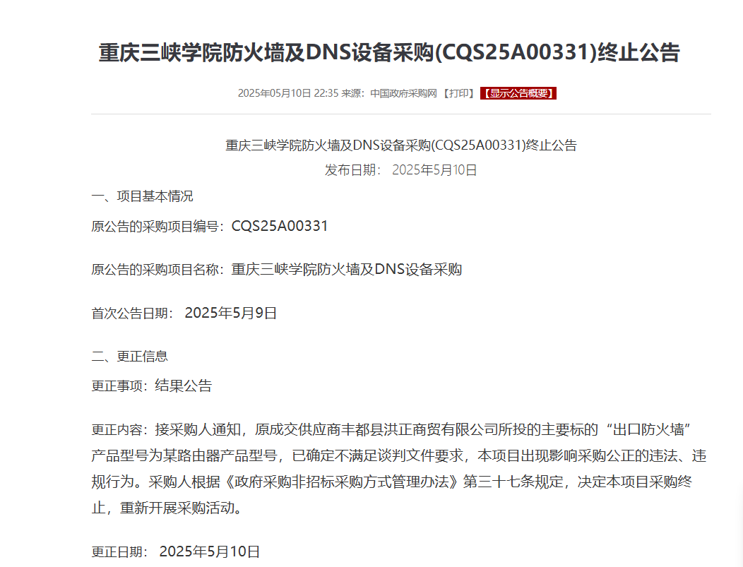 記者就此事搜索發現,2025年5月10日晚10時許,中國政府采購網發布了一則《重慶三峽學院防火墻及DNS設備采購(CQS25A00331)終止公告》,更正信息一欄中顯示:“接采購人通知,原成交供應商豐都縣洪正商貿有限公司所投的主要標的‘出口防火墻’產品型號為某路由器產品型號,已確定不滿足談判文件要求,本項目出現影響采購公正的違法、違規行為。采購人根據《政府采購非招標采購方式管理辦法》第三十七條規定,決定本項目采購終止,重新開展采購活動。”更正日期為2025年5月10日。
