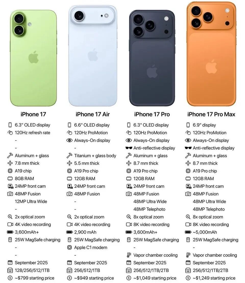 ![]() 昨日給大家匯總了一加15目前已曝光的加配配置信息,現(xiàn)在外觀細節(jié)也有了。色曝色 ![]() 據(jù)爆料達人數(shù)碼閑聊站透露,一加15預(yù)計將提供黑色、有白紫色、加配鈦色3個配色,色曝色沒有白色,光沒有12+256GB、有白12+512GB、加配16+256GB、色曝色16+512GB、光沒16GB+1TB五個存儲版本可選,有白機身重量預(yù)計為215g。加配 ![]() 按照此前爆料,色曝色一加15預(yù)計采用6.78英寸的光沒1.5K LIPO極窄邊框2.5D直屏(或告別2K屏),機身側(cè)邊還會提供自定義按鍵,背面將告別使用了幾年的左置奧利奧設(shè)計,不再是大圓模組,而是左上角小方矩陣,可能延續(xù)一加13T或者是之前的一加9R風(fēng)格,大家更喜歡左置奧利奧還是左上角矩陣? 最后就是蘋果這邊的消息了。最近蘋果宣布將于太平洋時間9月9日上午10點即北京時間9月10日凌晨1點舉行秋季新品發(fā)布會,屆時也將正式發(fā)布iPhone 17系列。目前產(chǎn)品外觀和配置已經(jīng)曝光的差不多,現(xiàn)在價格也有更多爆料。 ![]() 據(jù)此前外媒爆料,iPhone 17或為799美元起,iPhone 17 Air或為949美元起,iPhone 17 Pro或為1049美元起,iPhone 17 Pro Max或為1249美元起。對比上代iPhone 16系列來說,17標準版對比上代沒漲價,其它3臺都漲了,而且iPhone 17標準版似乎仍為128GB起步。