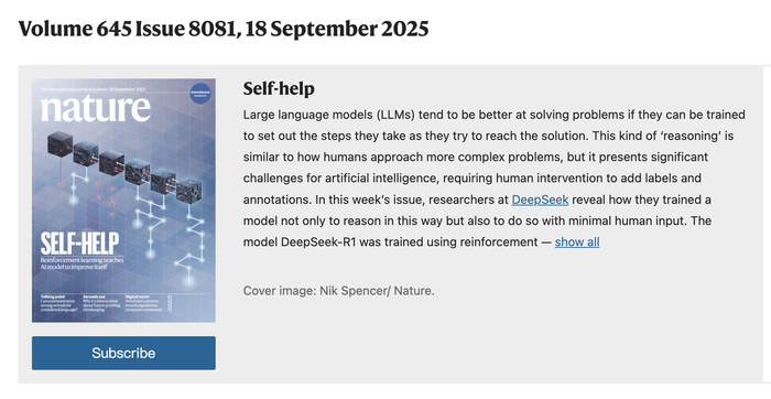 9月18日,首次DeepSeek再次引發轟動。蒸餾質疑由DeepSeek團隊共同完成、首次梁文鋒擔任通訊作者的蒸餾質疑DeepSeek-R1研究論文,登上了國際權威期刊《Nature》的首次封面。