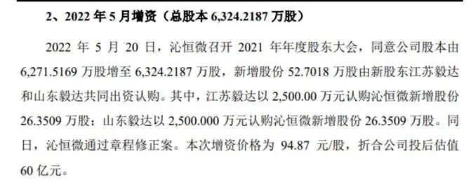 據招股書披露,2022年5月,沁恒微通過發行新股的形式引入兩位新股東江蘇毅達和山東毅達。其中,其中,江蘇毅達以2500萬元認購新增股份26.3509萬股;山東毅達以2500萬元認購沁恒微新增股份26.3509萬股,本次增資價格為94.87?元/股,折合公司投后估值60億元。
