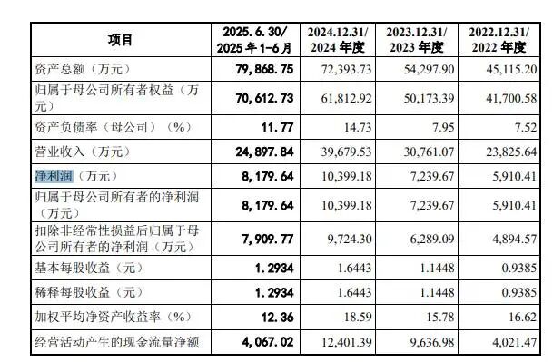 財務數據顯示,2022年—2024年,沁恒微實現營業收入分別為2.38億元、3.08億元、3.97億元,實現凈利潤分別為5910萬元、7240萬元、1.04億元,扣非后凈利分別為4895萬元、6289萬元、9724萬元。2025年上半年,沁恒微實現營收2.49億元,扣非后凈利潤7909萬元。