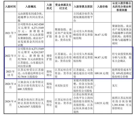 2023年12月,江蘇毅達、山東毅達與江蘇沁恒簽署了《股份轉讓協議》,協議約定江蘇毅達、山東毅達向江蘇沁恒轉讓其合計持有的發行人52.7018萬股股份,股份轉讓價格為109.1元/股,折合投資人年化收益率10%,轉讓價款為5750萬元,折合公司估值69億元。