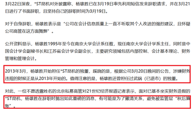 21世紀經濟報道2017年關于*ST昆機獨董楊雄勝的報道。