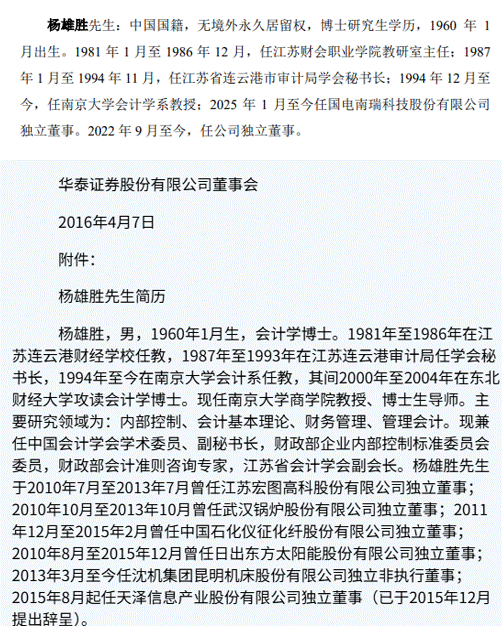 根據華泰證券2016年披露公告,楊雄勝2016年4月起擔任其獨立董事,至2018年2月份因昆明機床造假事件辭職,任職不到2年。楊雄勝自2010年起,曾先后在江蘇宏圖高科股份、武漢鍋爐、中國石化儀征化纖、日出東方、天澤信息等公司擔任獨立董事。但沁恒微的披露中,僅提到了楊雄勝2025年1月起擔任國電南瑞獨立董事,對于他1995年—2018年20多年的履職經歷只字未提。