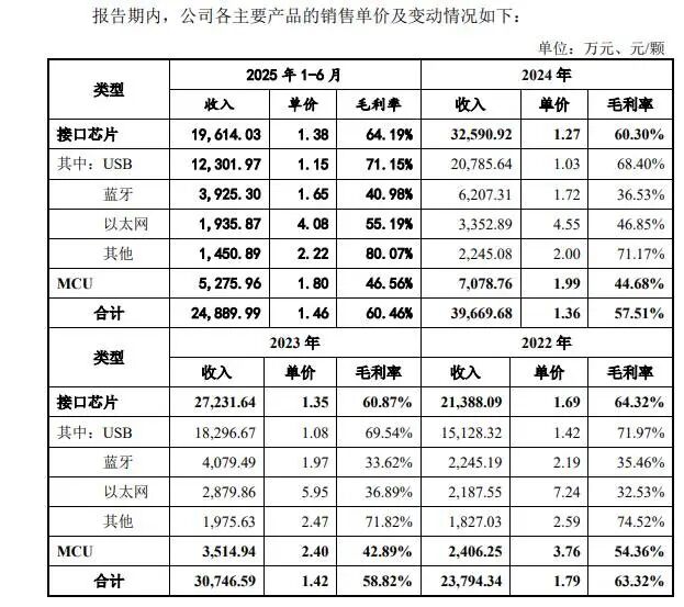 從財務數據看,沁恒微報告期內綜合毛利率保持在56%至60%之間,其中USB接口芯片的毛利率約70%。但需指出的是,沁恒微目前的高毛利率更多是一種階段性現象,而非可持續的競爭優勢。