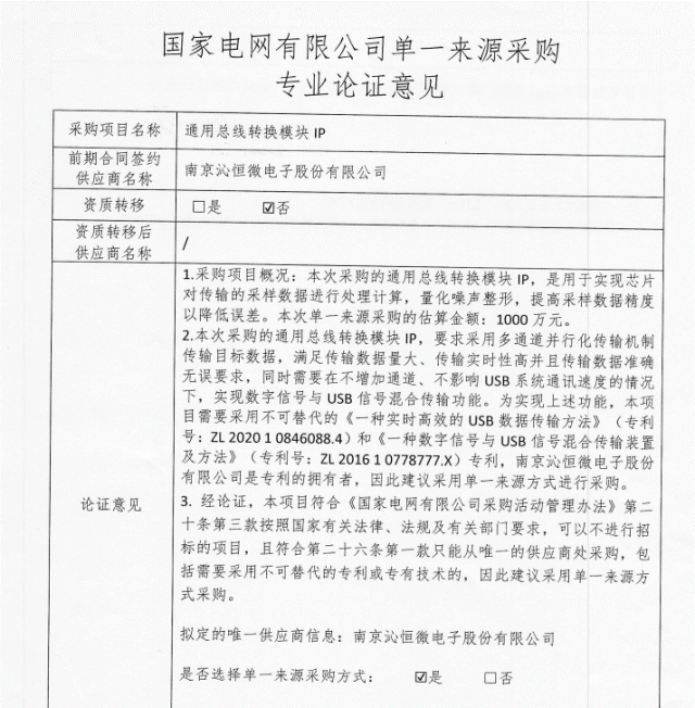 公開信息顯示,沁恒微2021年10月和2022年6月兩次參加了北京智芯微電子科技有限公司的招標活動。其中,2022年6月的采購中,國家電網出具的“單一來源采購專業論證意見表”顯示,采購標的為“通用總線轉換模塊?IP”,需要支持USB信號與混合信號總線融合傳輸,并引用了沁恒微擁有的兩項核心專利,結論稱,該項目“涉及不可替代的專利或專有技術”,因此只能從唯一供應商沁恒微處采購,總金額為1000萬元。