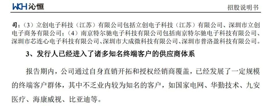 沁恒微在招股書中披露,報告期內,公司通過自身直銷開拓和授權經銷商覆蓋,已經發展了一定規模的終端客戶群體,其中不乏業內較為知名的客戶,如國家電網、華勤技術、九安醫療、海康威視、比亞迪等。
