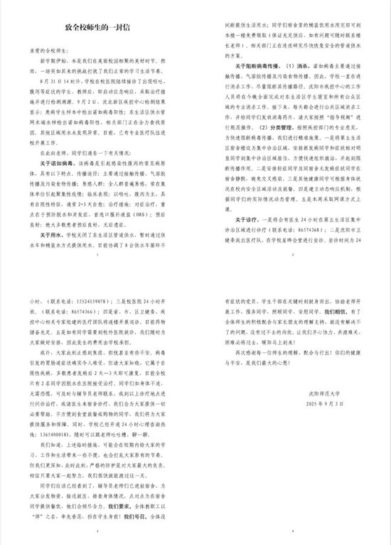來源:中國新聞周刊近日,部分沈陽師范大學學生發帖稱出現嘔吐、腹瀉及發熱等癥狀,引發關注。9月3日,沈陽師范大學發布的《致全校師生的一封信》以下簡稱“《一封信》”)中稱,8月31日14時許,學校在校醫院