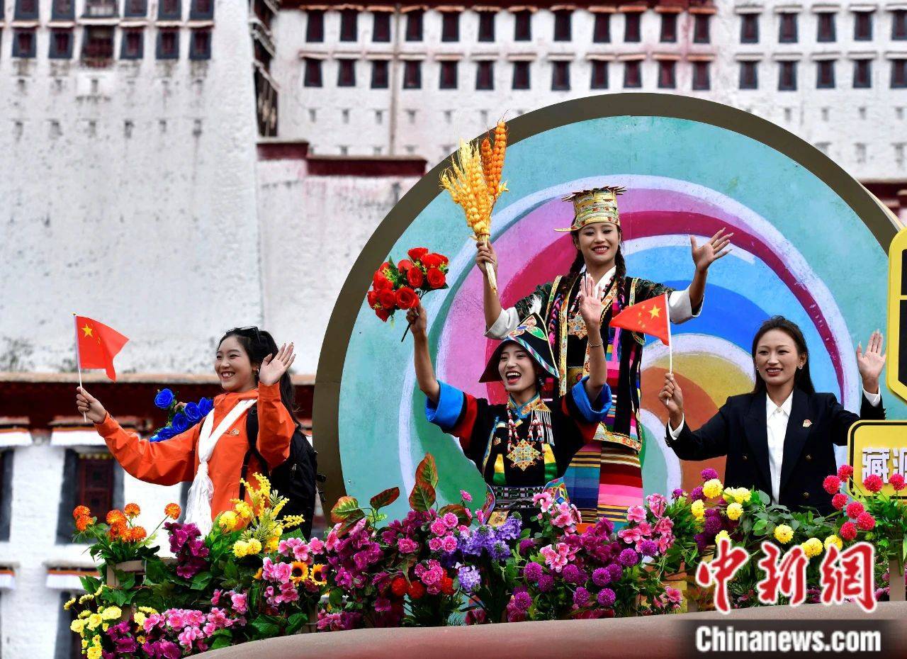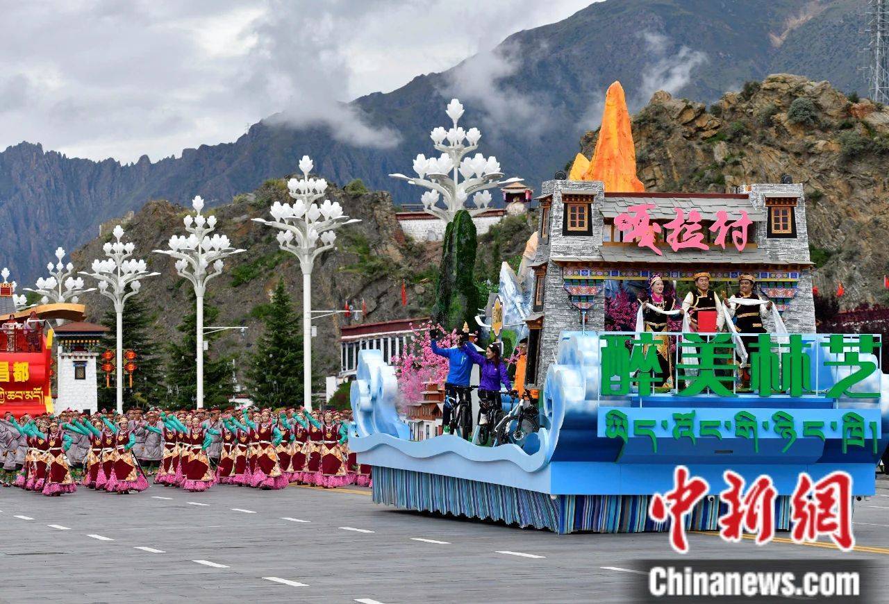 圖為西藏自治區成立60周年慶祝大會中的林芝彩車方隊。中新社記者 李林 攝