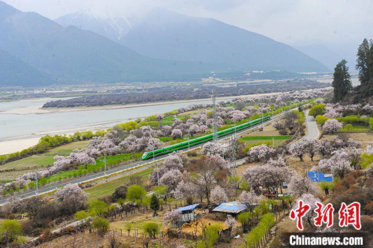 圖為穿梭在桃花林中的拉林鐵路高原復興號。 中新社記者 貢嘎來松 攝