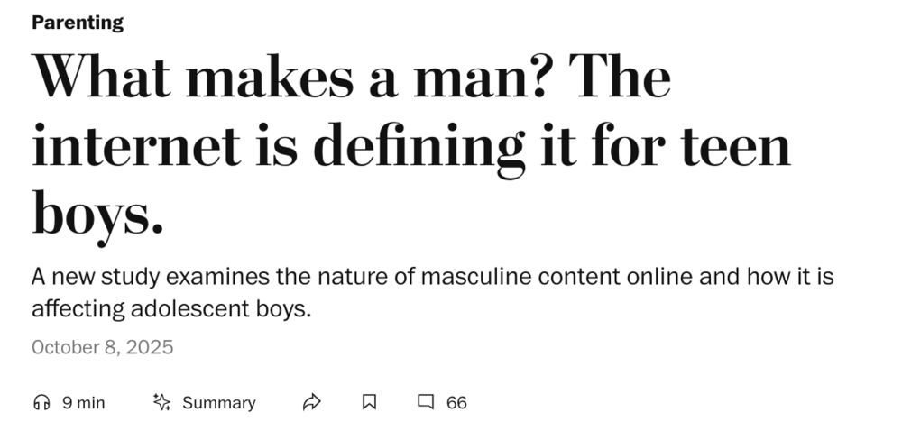 “...研究指出,網絡網紅已經成為青少年男孩獲取指導和情感支持的重要來源——這是一個顯著的世代轉變,因為以往的幾代人主要依賴親屬、社區成員或傳統媒體來尋找男性榜樣...”