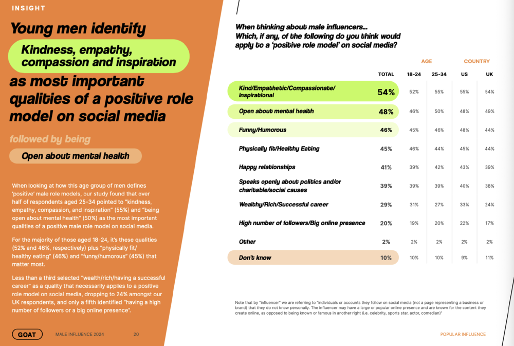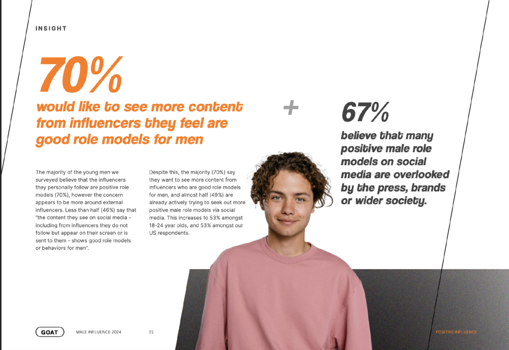 “70%的受訪者希望在社交平臺上看到更多男性榜樣的內容,同時67%的受訪者認為,現在很多正向男性榜樣被媒體和品牌忽視了。”
