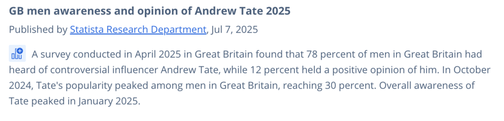 2025年Statista針對安德魯·泰特的一項調查顯示,78%的男性聽說過他,但僅有12%的男性對他持正面評價,這一比例較2024年下降了18%。